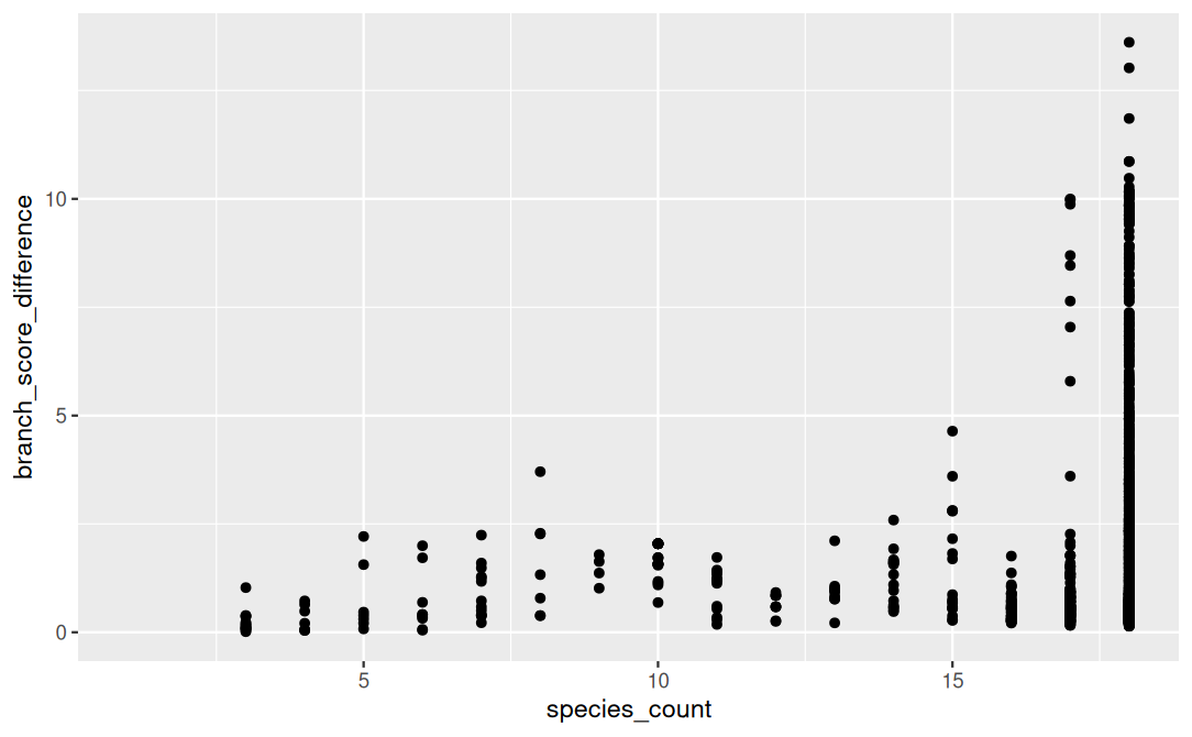 Figure 4. Branch score distance of gene trees vs species trees, grouped my taxa coverage.